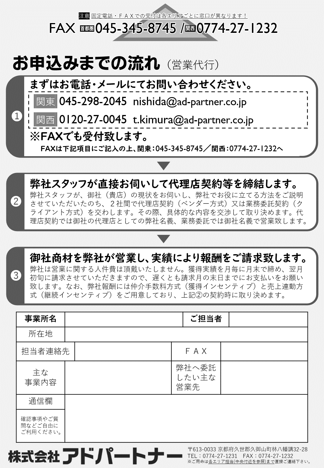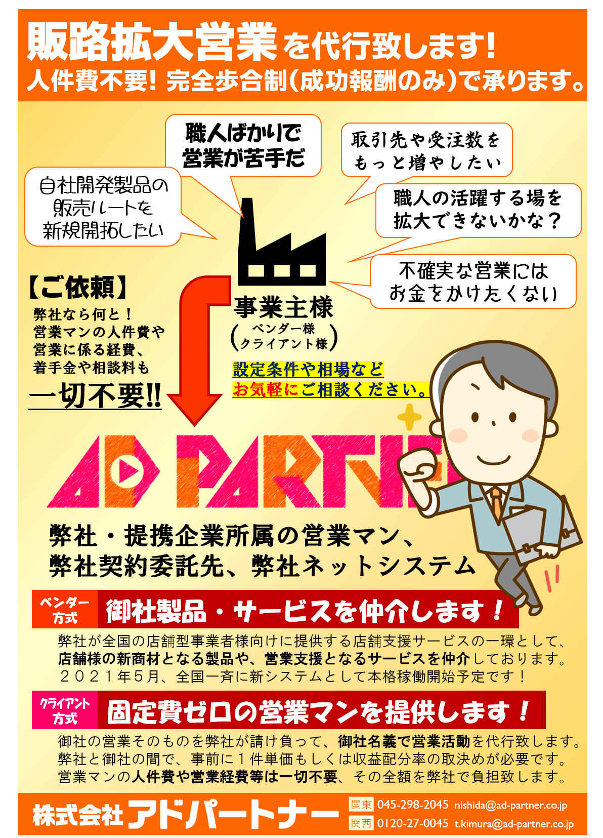 斡旋・仲介をお任せください御社商材・サービスを御社に代わって斡旋・仲介致します。人件費不要、成功報酬のみ申し受けます。 ご依頼・ご相談は、 (神奈川営業所 西田)まで